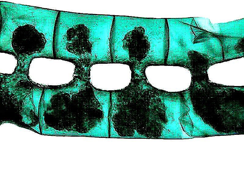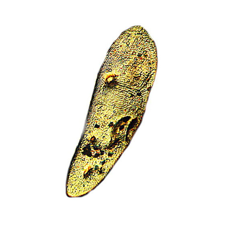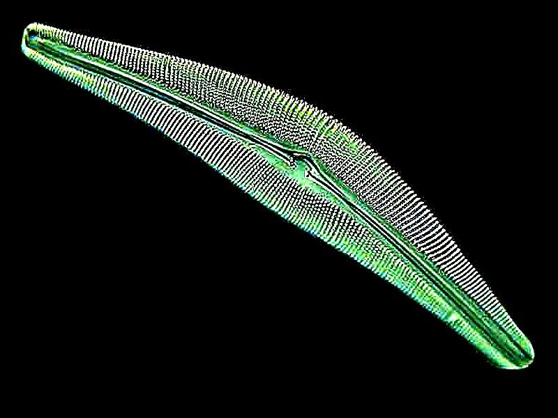 Let’s leapfrog back to take a look at a really splendid diatom called Cymbella. Each of the little “dots” is a pore through which protoplasm streams, thus providing a slow, gliding motion to the organism.