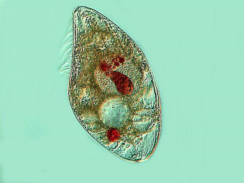 Blepharisma is notorious for its unseemly behavior toward members of its own species; when things get sparse food-wise, they can turn cannibalistic and engulf others thus turning them into cannibal giants. Here’s an image of one and the red lumps are Blepharisma that have been devoured and are slowly being digested in vacuoles.