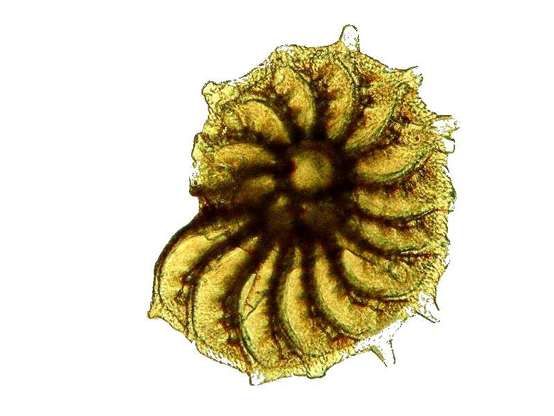 While we’re looking at protozoa, let’s examine a few foram (foraminifera) “shells”. These are primarily composed of Calcium carbonate and are often opaque, thus hiding the internal complex chambers. I devised a technique using a drop of oil (usually immersion or cedar oil), to enhance internal visibility. The 2 examples below use that technique.