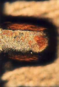 A primary use of such a microscope is the study of highly polished and chemically etched metal surfaces. Another common use is the inspection of flat surfaces with fine detail such as microchips. The photographs below are of the E in the motto "E Pluribus Unum" on a Lincoln Penny. Including the shadow, the E is 0.3mm high. The oblique illumination photographs used a Nicholas Illuminator from a stereomicroscope as the light source. This provides a parallel beam of light much larger than the field of view, and the only control (besides the lamp position) varies the voltage to control the light intensity. As can be seen in the photographs, the diaphragms in the axial illuminator provide control over the depth of field and superior glare control compared to the Nicholas illuminator, especially for high power objectives with scant working distance. These are important for the intended uses of the instrument.