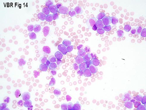 Fig 14. Bone marrow smear – acute myeloid leukemia with abnormal erythroid precursors (50x oil objective).![]()