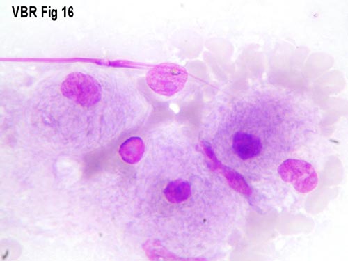 Fig 16. Gaucher cells (congenital storage disease), spleen touch imprint smear (100x oil objective).![]()