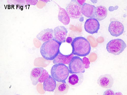Fig 17. Bone marrow smear – acute myeloid leukemia with abnormal erythroid precursors (100x oil objective).