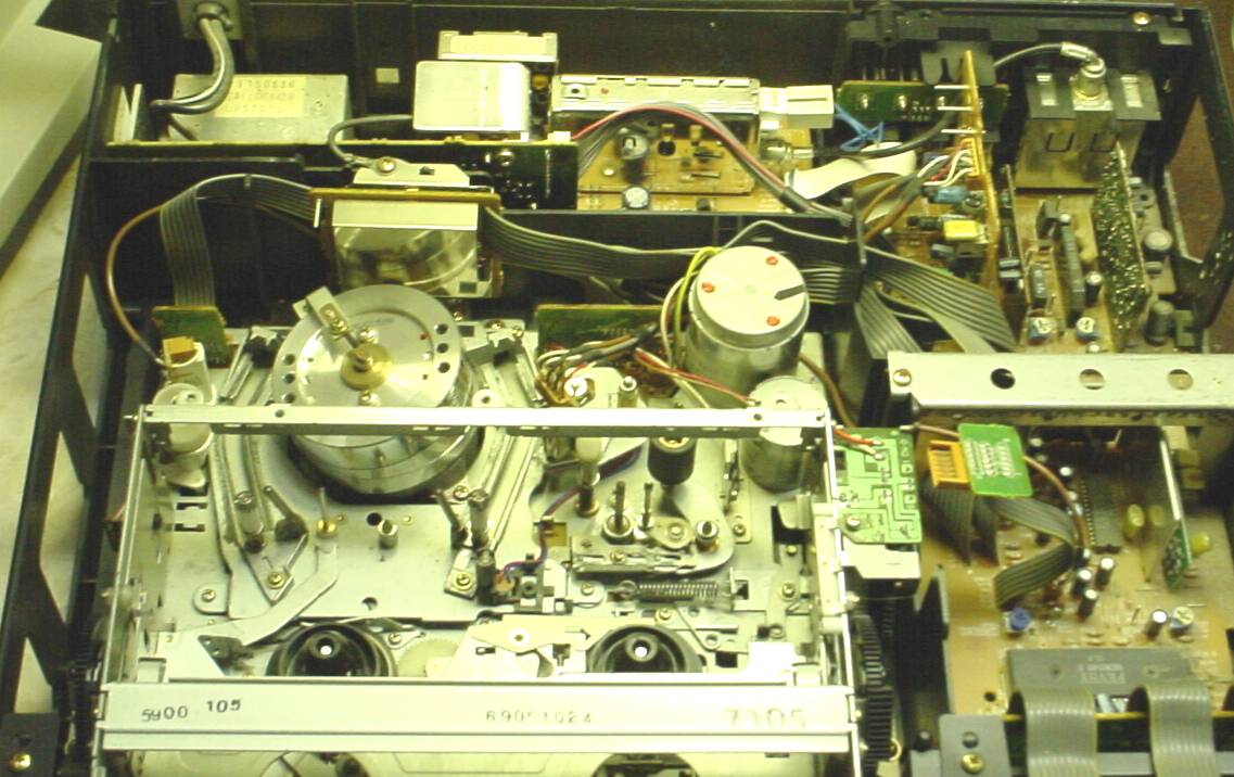 The ringing table described here is built using parts from a discarded VCR plus some additional "found" items like scrap wood, a hinge, and some wood screws. Although my out of pocket cost was nil, it did take several hours to construct the unit so it's a labor of love rather than a money saver. Much of my time was expended constructing internal storage for the commonly used ringing materials, a nice touch but labor intensive.This project requires the typical tools collected by a homeowner plus a few odd items. Power tools for wood working are an asset but not necessary; in particular, a drill press (aka pillar drill) [a hand drill will work], a router, a grinder (and/or a Dremel Tool), and an electric sander are helpful. One oddball tool which isn't common: a 2 1/8" hole saw is the simplest way to make the large hole for mounting the rotating table. Also useful are 6-32 and 4-40 taps and a tap wrench. A small Allen wrench (0.057 across the flats, 1.5mm??) is needed — the size may be different on your VCR...
