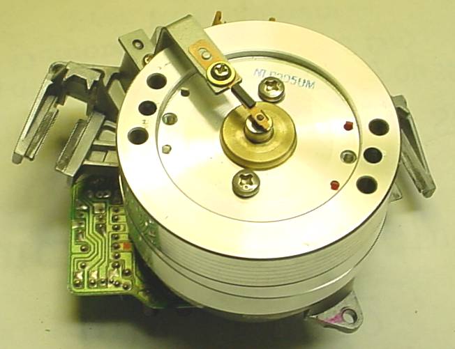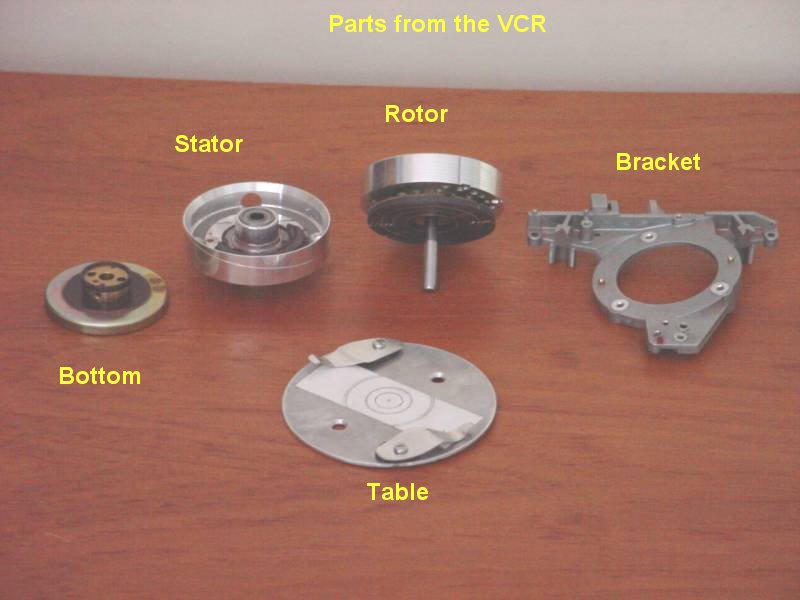 Remove the cover from the VCR to gain access to the innards. It took 3 minutes to remove the needed part. Here is another picture of the major component you'll need from the VCR (this one from a 2nd VCR). It is fairly easy to recognize since the rotor is 2.5" (actually, 6cm) in diameter and it is located almost centrally behind the opening where the tape is inserted. It is generally supported on a bracket secured by 3 screws; unplug or cut the wires involved and remove the screws to extract the complete assembly. (In the second picture, all the wiring and extraneous parts have been removed.) Give the rotor a spin before removing it — it should continue for at least 30 seconds and be noiseless else you need to find another unit. (After completion, I found my table will spin for 1 minute and 22 seconds when given a vigorous flip.)To remove the bracket from the motor, remove the lower section of the motor (below the bracket) using an Allen wrench to loosen the set screw. Remove the screws which secure the stator to the bracket and the complete motor and head assembly will lift off the bracket. Remove the cap (if any) from the top of the shaft with pliers (it just pulls off).