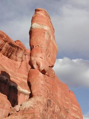 Walking a “Fin”, as I discovered, was not my favorite mode of travel. Most of the Fin was about five-foot wide, except for those parts that were four-foot wide. I kept to the lee side, where the drop down was only about twenty-five feet. To starboard it was a sheer drop of 300-feet. The wind was up and kept buffeting me to starboard.We were on a 6-mile hike along the Devil's Garden Trail at Arches National Park, Utah. I have no pictures of the Fin we hiked on. The lead picture shows a Fin that we saw on the Fiery Furnace Trail later that afternoon. It is a bit of an exaggeration, since the Fin we hiked on started and ended on solid footing, but I felt as unstable as the knob atop this one appears. Fins are created by erosion and, as you will see, erosion is an essential theme of this story.