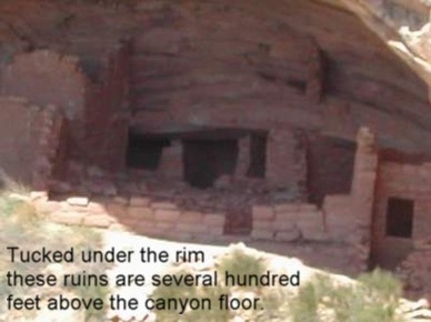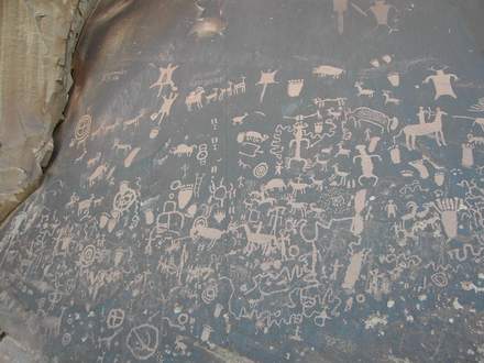 We found a number of abandoned cliff dwellings. Over a span of 8,000-years the “ancestors” [called “Anasazi” by the Navajo] built stone houses and lived on flat-floored niches in the cliff faces of canyons [REF 4]. Frequently they decorated vertical surfaces nearby with petroglyphs, which may have served as warnings, religious symbols, or simply “news”. Cliff dwellings and petroglyphs are found throughout the Colorado Plateau. Wind, cold and water also shaped the ancestors’ life-style, forcing them to abandon the cliff dwellings during the 12th century AD. In Utah, cliff dwellings are small and usually quite old, but in Chaco Canyon, New Mexico, the ancestors built a large central city with four-story stone buildings and some 400-miles of paved road. My photograph of Cliff Dwellings was taken in Cedar Mesa, and the photograph of petroglyphs was taken at “News Rock”, near Canyonlands.