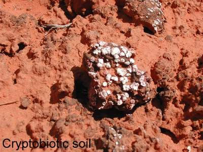 The binding quality of the cyanobacteria is evident from the observation that the angle of repose for dry cryptobiotic sand is much steeper than for ordinary dry sand, which is about 34°. You can get a sense of this by examining the larger fragments in the picture of cryptobiotic soil. The face of the dark mottled area to the right of the lichen-dotted fragment was almost perpendicular. At many places on the Colorado Plateau I saw large expanses of stable dry sand on slopes as steep as 45°. This crust resists wind erosion and, to a great extent, water erosion.