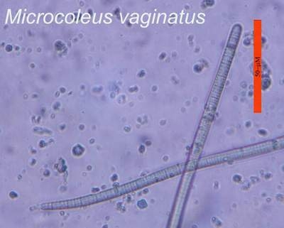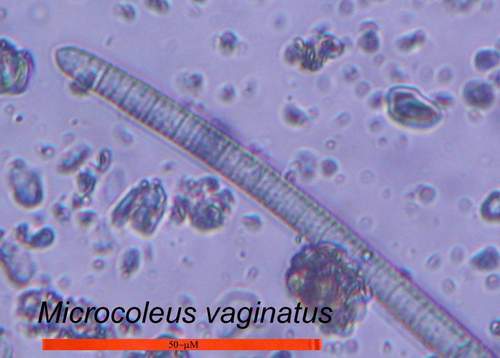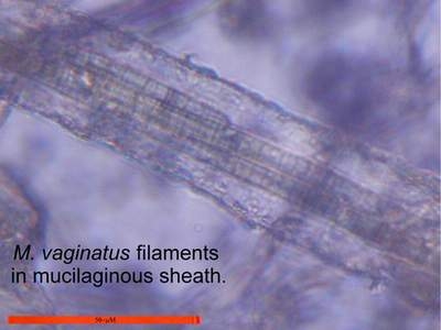 In dry soil, M. vaginatus remains dormant in a cryptobiotic [desiccated] state. When water is provided, the bacterial filaments come out of dormancy and, given sunlight, begin growing rapidly. I examined dry cryptobiotic sand and found no apparent cyanobacterial filaments. When water was added, filaments were evident within a matter of minutes.