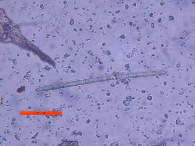 Scale bar 50 µmM. vaginatus is a large, filamentous green cyanobacterium. Each segment in a filament is an individual bacterium. Filaments range considerably in length. Shown below is a short filament, but I found some filaments as long as 300 µm.