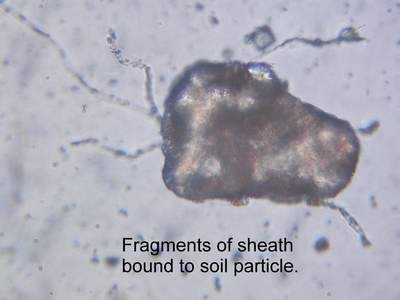 Scale bar 50 µmThis sticky mucilaginous sheath binds the filaments to soil particles, producing a matrix that is sufficiently strong to make the soil surface crusty. As the soil dries out, the filaments return to a cryptobiotic state, and the sheath around them remains connected to the soil grains, pulling the grains tightly together.