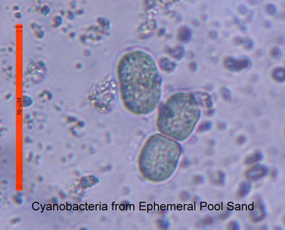 Scale bar 50 µmPerhaps the most fascinating of these other communities were ephemeral pools: Shallow sandy-bottomed depressions in the rim rock above the canyons. I tried to photograph the Whiptail lizard shown earlier as it paused in such a depression, but it hurried on to bare rock. A microscopic examination of the dry sand from one of these depressions shows only a few diatom skeletons. Such depressions fill with water after a rain, and from the sand explodes a community of microbes: Cyanobacteria of many kinds, diatoms, algae, fungi, lichens, protozoa, rotifers, nematodes, and higher creatures that have found ways of surviving periods of intense cold, heat, and desiccation. Some produce resistant spores or other propagules, some enter directly into cryptobiotic states, but all are equipped to rapidly return to active metabolism when the rains come and all complete a life cycle with the metronome ticking at “presto”. In the photomicrograph above, green cyanobacteria were apparent within minutes of adding 100-microliters of water to a little dry sand in a depression slide. In less than an hour, these motile cells were dividing and moving at their slow and stately pace!