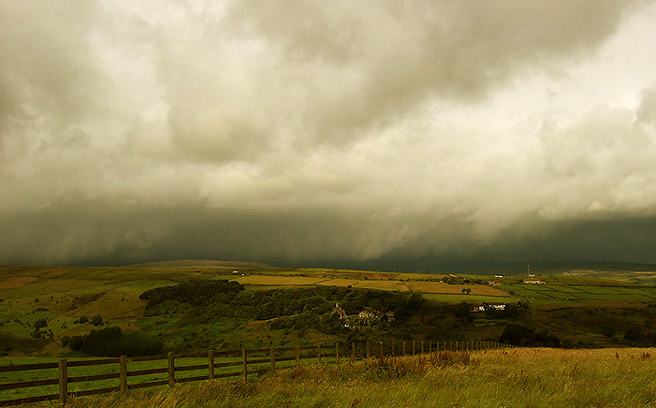 The sun has nearly gone...last few minutes before the deluge, a wide angle shot still looking towards the Church, lower centre, the cloud base is now almost at road level, a few moments later the Church disappeared from view.
