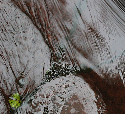 On the left a solitary leaf caught under the eddies of a fast flowing stream and on the right showing detail of the gritty colourful rocks .