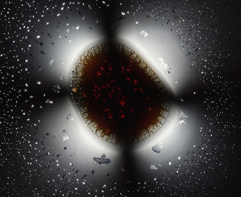 Above and below, ascorbic acid crossed-polars, Zeiss 10x A-Plan NA 0.25 objective above and 20x A-Plan NA 0.45 below, the slide below is a tiny crystal formation at the edge of a preparation from a collection of slides specially prepared and recently donated by Mike Samworth, thanks Mike!