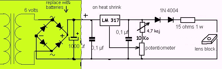 The coil resistance is around 8 ohms and working current around 100 mA: you must make an electronic circuit like that below (in fact a variable power supply!) to feed the coil. Lens displacement will be around 1 to 1,5 mm, controlled by the potentiometer. It's easier to use 2 x 4,5 volts batteries in series (9 volts), to replace the transformer, rectifiers and 1000 µF capacitor. If you want to displace the lens up AND down with the same potentiometer, you must use a bipolar power supply, and the circuit becomes more complex. |