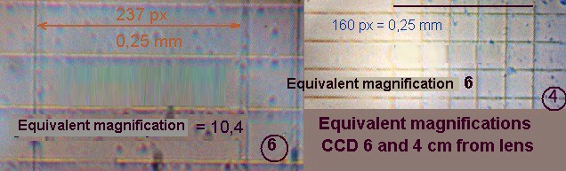 The equivalent magnification (ie: magnification of a real objective, if webcam was fitted on the 16 cm tube of a classical microscope) is between 6 times and 10 times according to distance: Lens - CCD (respectively 4 and 6 cm). A x6 magnification is quite ideal to explore quickly a sample and to pick the more interesting subjects with a micro pipette. |