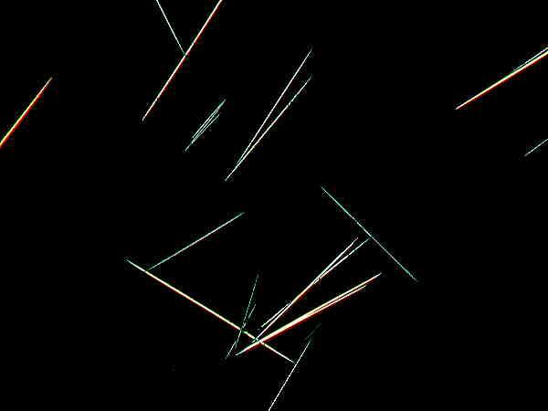 The acicular character of the crystals is quite clear and notice that, under polarization, some have that bluish-white luminescence that is typical of the Ficus crystals, whereas others have pastel red, blue, or purple coloration.