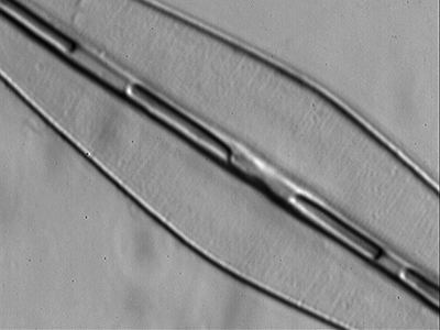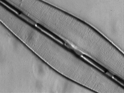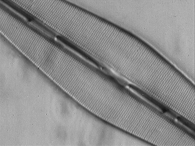 Above - 400 nm interference filter, punctae clearer over whole frustule cf the deep blue.