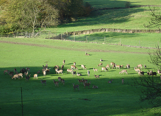 After the wooded area panoramic views start to open up on our left as we pass a cottage on our right and as we continue further the track widens to a pot holed gravel track [unmade road] as we come to a further large cottage, here we have an option. We have a choice as the track veers left going down further into Jagger Green valley marked clearly 'public bridleway' where further marked paths can either be taken along the stream by following the footpath sign on the left through the metal style or continuing along a winding path the latter of which soon passes a fairly large ornamental pond belonging to a private residence. If following this route we would come to go two very large styles big enough for horses and here a good view of the deer is possible but you must be quiet as they may be close by. Rutting season in autumn brings the stags to defend their females from other males and make those strange but powerful calls. It's 'all ears' to the front with the deer even if they are many yards away as they have keen eyesight and hearing.