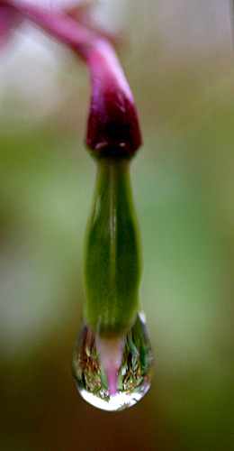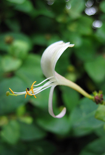 A drop of water reflects the surroundings whilst a honey suckle flower supports a small fly.