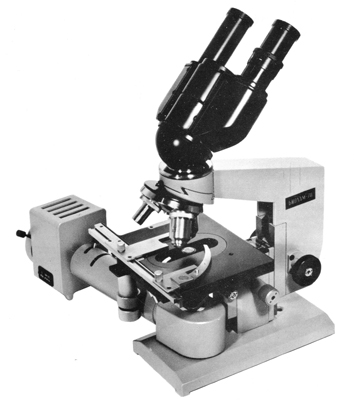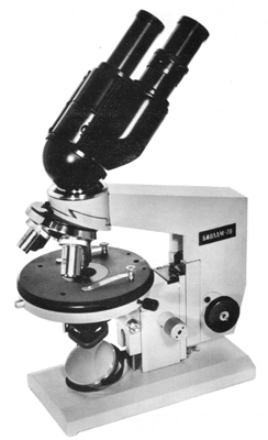 A metallurgical stand with top lighting. Supplied with 8x, 12x, 31.7 planachromatic objectives and six magnifications of eyepiece.