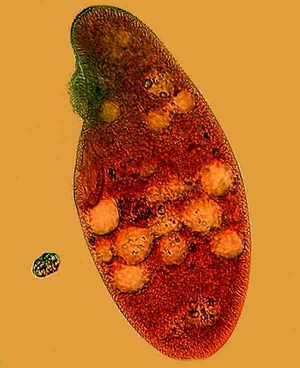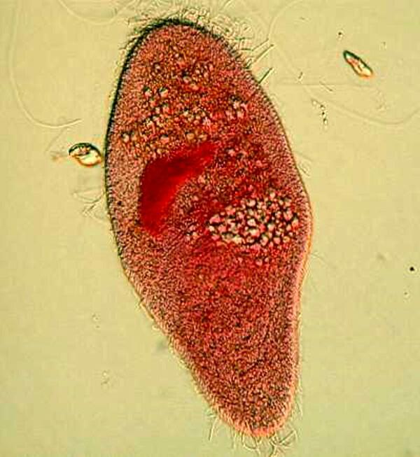 4) Neutral Red–There is a deep staining of vacuoles, some staining of the pellicle, a massive discharge of trichocysts and light staining of the cytoplasm. Initial contact with stain tends to produce hyperactivity.