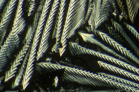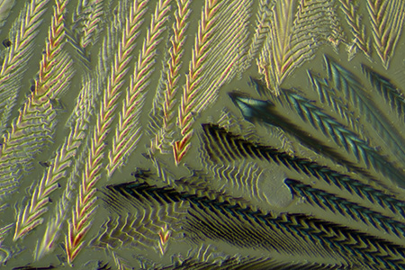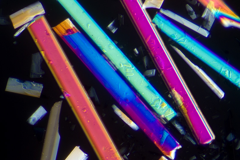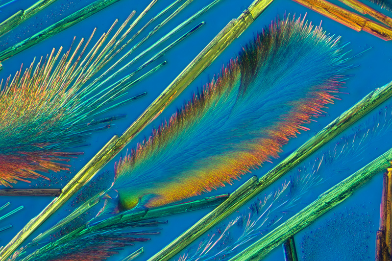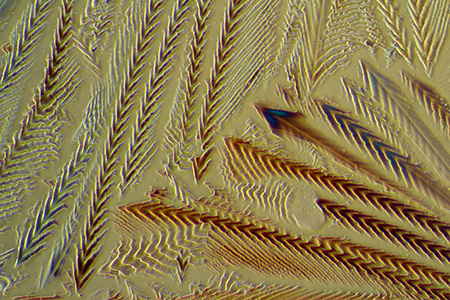 The sequence of five images below show santonin (Baker slide), first between crossed polars and then the effect of adding one of the following plastic retarders: l/4, l/2, l (530 nm) or l (560 nm) from Knight Optical.. The full wave plate with the traditional tint of a 'first order red' has a specific use in polarised light microscopy e.g. of rocks and minerals, but as a modifier in 'artistic' polarised light imagery, the colour may jar as a background colour with some subjects. I often prefer the full wave plate which creates a gentler blue. Retarders for this sort of work don't have to be the highest optical quality, as they can be sat on the polariser beneath the stage and approximately aligned at 45 degrees to the plane polarised light. A variety of plastic sheets from around the home can also be tried, e.g. the cellophane that wraps greetings cards. |