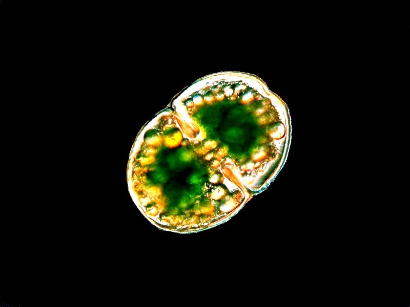 This is a freshwater algal form, namely, a desmid which here clearly displays its chloroplasts.