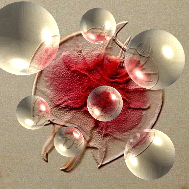 There is a fascinating effect called MULTIVISION FILTER which allows you to take an image and create duplicates in the background. You can choose to arrange them circularly, linearly, or symmetrically. For the circular arrangement, there are custom defaults of 5, 10, 18, and 25 images, but you can manually choose exactly how many you want. Furthermore you can select the radius, transparency, softness, and rotation. Here I will select a circular arrangement of 5 and a transparency of 20. The result is such that it looks like we have a rich culture of Keratella.