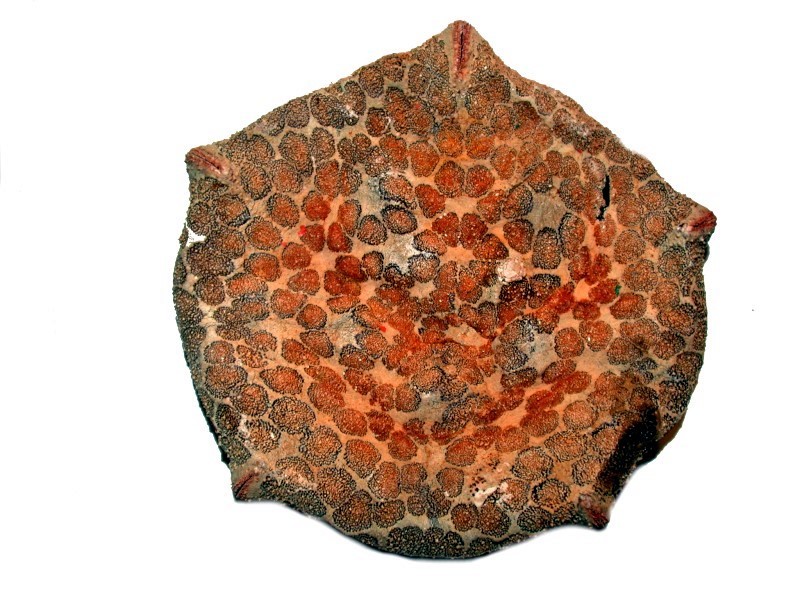 Now, if we flip over to the other side (aboral), we find in the central disk, the madreporite surrounded by tiles (plates) of relatively substantial size. The madreporite is, as mentioned earlier, that filter which looks like a bit of coral and keeps debris from entering and creating blockages in the water vascular system which controls the extension and withdrawal of the tube feet.