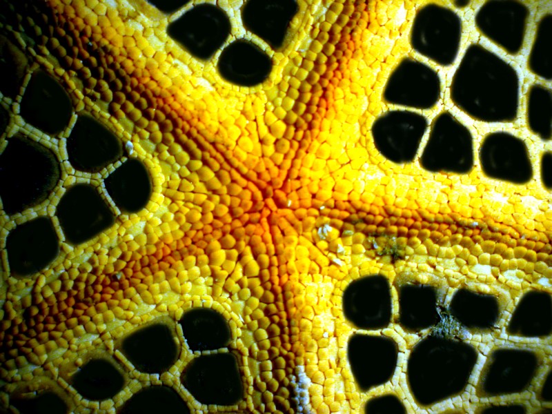 Quite unusual looking creatures. Next thing you know, we’ll be finding specimens with tiled surfaces, tessellation. And, indeed we shall; first, I’ll show you the oral side of a small starfish and here we see the intricate patterns that are repeated over and over.