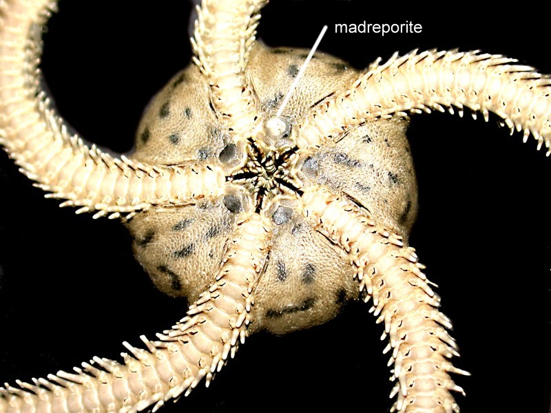 They are indeed stellate in form and almost always have 5 arms. So, how does one distinguish them from the classical “sea stars”? Fortunately, there are several criteria that allow one to make this determination quite readily: 1) The madreporite in starfish is on the aboral (dorsal) surface whereas in ophiuroids it is located on the oral (ventral) surface–when visible; it is often difficult to detect at all. 2) The oral surface of a starfish has a “channel” running down its length and that is where the tube feet are located, whereas in the ophiuroids, there is a series of plates running down the length of the arms and no channel. The tube feet are reduced to papillae. 3) The connection of the arms to the central disk in starfish is such that they are usually seen as an extension of the disk, whereas in the ophiuroids, the arms are quite distinctly demarcated and it is this jointed character that allows for the fluidity of their movement.