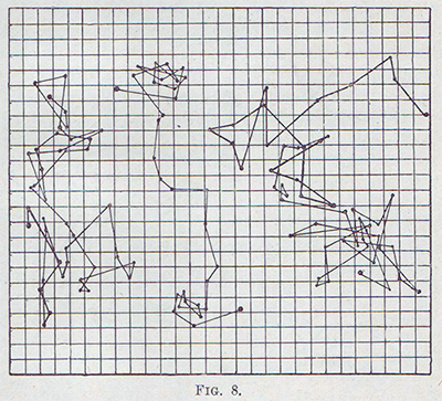 8 from Perrin's book 'Atoms'. It shows the plotting of three individual 'mastic' grains 0.53 microns in diameter at 30 second intervals. Perrin notes that sixteen divisions of the grid depict 50 microns.