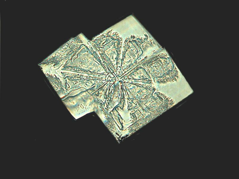 Magnesium chloride (I don’t want to have to keep typing this so, from now on, let’s simply use MC) is a fascinating substance; it provides very small, highly geometrical crystals in large number with great diversity on a single slide. However, this means that you need to scan patiently at moderate to high magnifications. However, the fun is just beginning; MC is deliquescent and readily “pulls” water out of the atmosphere. I live in an area which is described as “high plains” or sometimes “semi-desert”. So, those of you who live in humid places will have an even greater problem What problem? Well, these are thirsty little crystals and when they extract moisture from the air, they can dissolve or partly dissolve and then change form and do this faster than you can wave a wand. In practical terms, what this means is that you need a quick trigger finger on your camera when you find a crystal that you want to photograph.