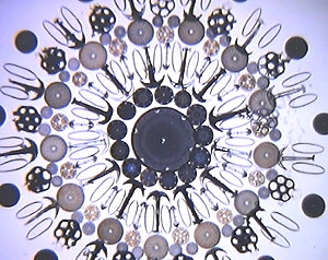 | I eventually found the answer in The Microscope & it's Revelations by W. Carpenter revised by W. Dallinger 1891, 7th Edition page 819. They are plates that are attached with an anchor in the skin of Holothuroidae the double-ended anchors may be as I first thought sponge spicules. Fig. 1 right is of the diatom + arrangement. The photo' was taken using a X20 flat field objective with a X6 eyepiece at 1/30th sec. on Kodak film using 40 cyan and 40 magenta filters. | ![]() |