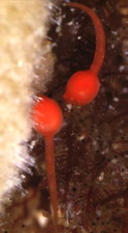 following year. Ascidians are hermaphroditic. Most large solitary species shed high numbers of weakly yolked eggs into the sea, coincidentally with the release of sperm from other individuals. External fertilization is followed by the development of a free swimming tadpole larva, rarely more than 5mm long. However, there is a great deal of variation in the reproductive strategies of tunicates. Colonial species, like Botryllus, and many small solitary ones have few eggs and incubate their embryos in their body, near the atrium. It is not too difficult to see something of the biology of these animals. They are easy to collect on every rocky shore or on wooden poles or jetties. The tadpole larvae are often present in plankton catches. |