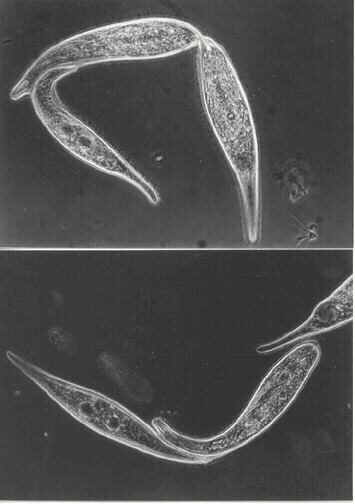 The following two photomicrographs were taken by me using the water I collected from a local lake. I believe they are of the Amphileptus species and thought their behaviour unusual. The upper image shows the three protozoa joined in fission and conjugation. The lower image shows one that has separated from the fission stage. I would appreciate any reader's opinion about this observation as I'm not really sure what the images are showing.