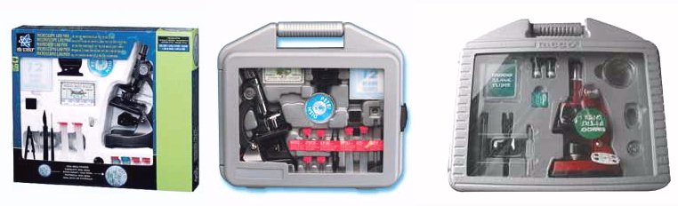 | It's not difficult to find microscopes in toy shops with prices between $25-40. Maybe you have bought one of them. They are toy microscopes and nowadays their quality is poorer than 10 years ago, but they are usable for low power magnification. Don't forget that the best pictures are obtained between 60 to 100 times. (Magnifications over 200 or 300 times are difficult to use with these simple products). Some of them have a device which projects an image onto a small screen. The image is not very bright but can be seen by several children at a time. If you can, choose a microscope with a more rigid metallic body. (Below are some examples of microscopes for children). | |