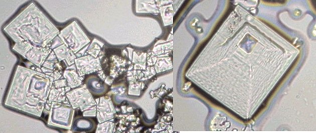 | Salt crystals (sodium chloride) - but don't look at crystals straight from your saltcellar because they are broken: Melt half a teaspoonful of salt into a half a glass of tepid water, take a drop, put it on the slide and allow to evaporate. Beautiful cubic crystals will grow on your slide. The crystals will be larger if evaporation is slower; if you put the slide in a warm place, crystals appear more quickly. Also try with baking soda (sodium bicarbonate), salicylic acid (aspirin), and vitamin C if you have this medication. (Observe the crystals WITHOUT using a coverslip). | ||