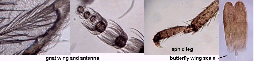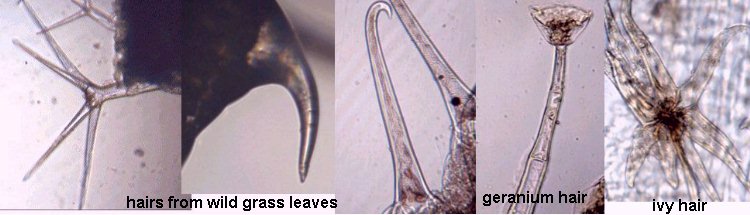 | By observing plants, even wild grasses, you can see some hairs on the stem. Make a small slit in the stem and pull off a fragment with small forceps (or use your mother's or sister's nail clippers; but don't forget to return them clean!). Mount the stem fragment in a drop of water under a coverslip and observe the great variety of hairs. (See my previous Micscape article on plant hairs). It's not really the right season, but some aphids or insect molts can be found in grass. Look closely at them. | |||