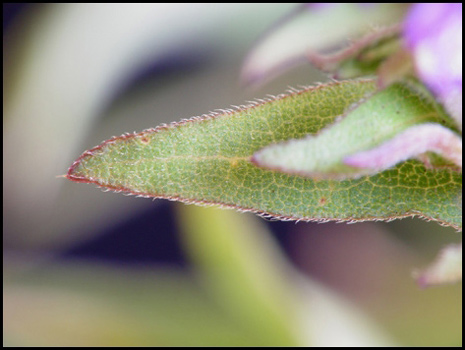 Notice that the edge of the lance-shaped (lanceolate) leaves is also purple, and has very fine hairs around its perimeter.