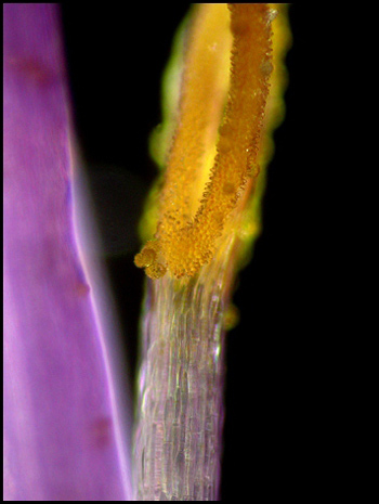 Under the microscope, (again using dark ground illumination), you can see one of the anthers in focus, covered with pollen.
