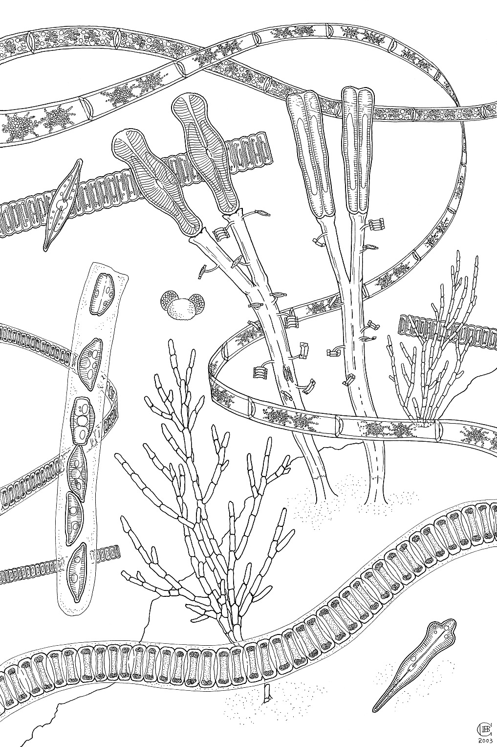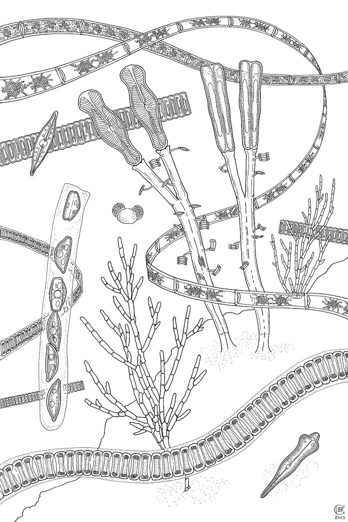Some of the illustrations are composite images created from drawings made over the duration of the week-long course. I have tried to convey the effect of a "micro-world" in which algae are depicted living in the underwater environments particular to them.