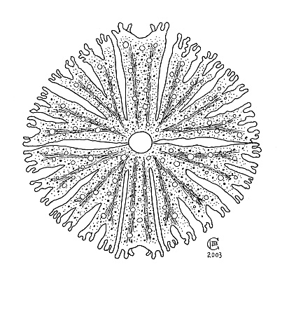 I arrived at my interest in algae via a somewhat unusual route. Originally having studied fashion and textiles, I moved on to botanical painting and drawing, eventually progressing to drawing microscopic subjects. An admirer of the work of artist Wim van Egmond, whose work can be seen online in microscopy magazine Micscape, and that of the 19th-century German artist Ernst Haeckel, author and illustrator of Art Forms in Nature, I was fascinated by the wealth of shape, form and texture to be found in their observations of microscopic plant life, and was inspired to create similar artwork. It being evident from my early attempts at pond dipping that I needed experience in collecting material, and a better understanding of the organisms viewed down my microscope, I enrolled on the Freshwater Algae course taught annually by Eileen Cox and Elliot Shubert at Kindrogan Field Studies Centre in Perthshire, Scotland.