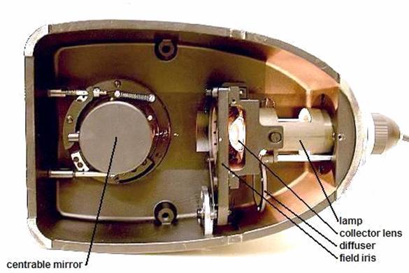 The illuminator consists of a Köhler base and the condenser. The remarkably simple base uses a 6V 15W Tungsten lamp of which the filament is factory centred: there are no separate centring screws for the lamp. This filament is projected onto the condenser iris by a single collector lens, via a centrable first surface mirror. Half of the base is actually covered with a metal plate against dust, which is removed for this picture: