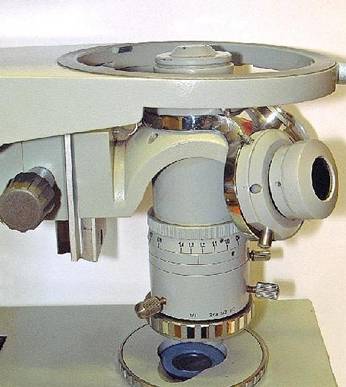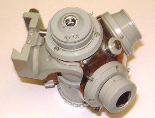 The objectives are mounted on a sliding nosepiece, which is similar for Zeiss-Jena and LOMO microscopes. This works very efficiently for more then one set of objectives.