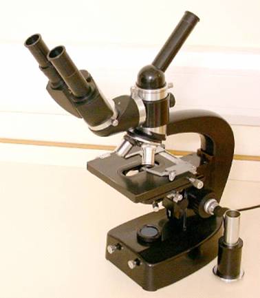 The bino-head is coupled to the microscope via a ‘D’ elbow piece. This incorporates a Telan lens system, so that it does not increase the optical tubelength. Indeed, a straight monocular tube can be fitted either via the D-joint or directly on top of the arm of the microscope. The latter is actually my preferred option for critical microphotography where I do not want any prism or other glass in the way between the objective and the ocular.
