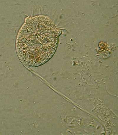 Another ciliate which shows up very frequently in my old samples and cultures is Cyclidium glaucoma. This organism has long caudal cilia rather like bristles and an undulating membrane around the cytostome. Its behavior is both fascinating and frustrating. It will sit motionless on the substrate, sometimes for minutes at a time and then just at the moment when you rotate you turret to examine it with a higher powered objective, it bounces off out of the field of view as though it were spring loaded. Halteria grandinella is also a leaper.