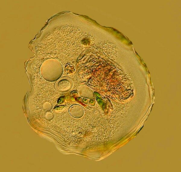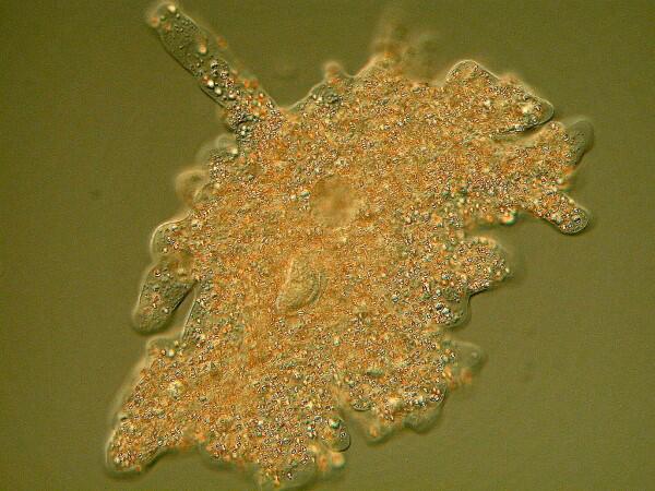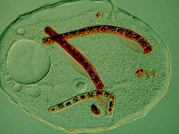 13. Thecamoeba. These remarkable creatures have a textured membrane, are often found in cultures made from soil taken from potted plants, and have both unusual morphological and behavioral characteristics. You can see that it has ingested a rotifer and some filamentous algae.